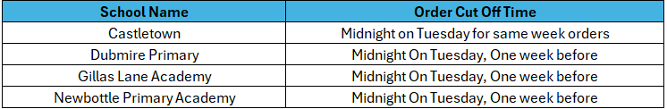 Welcome to the Ordering Cut-Off Times page for Sunderland Schools.